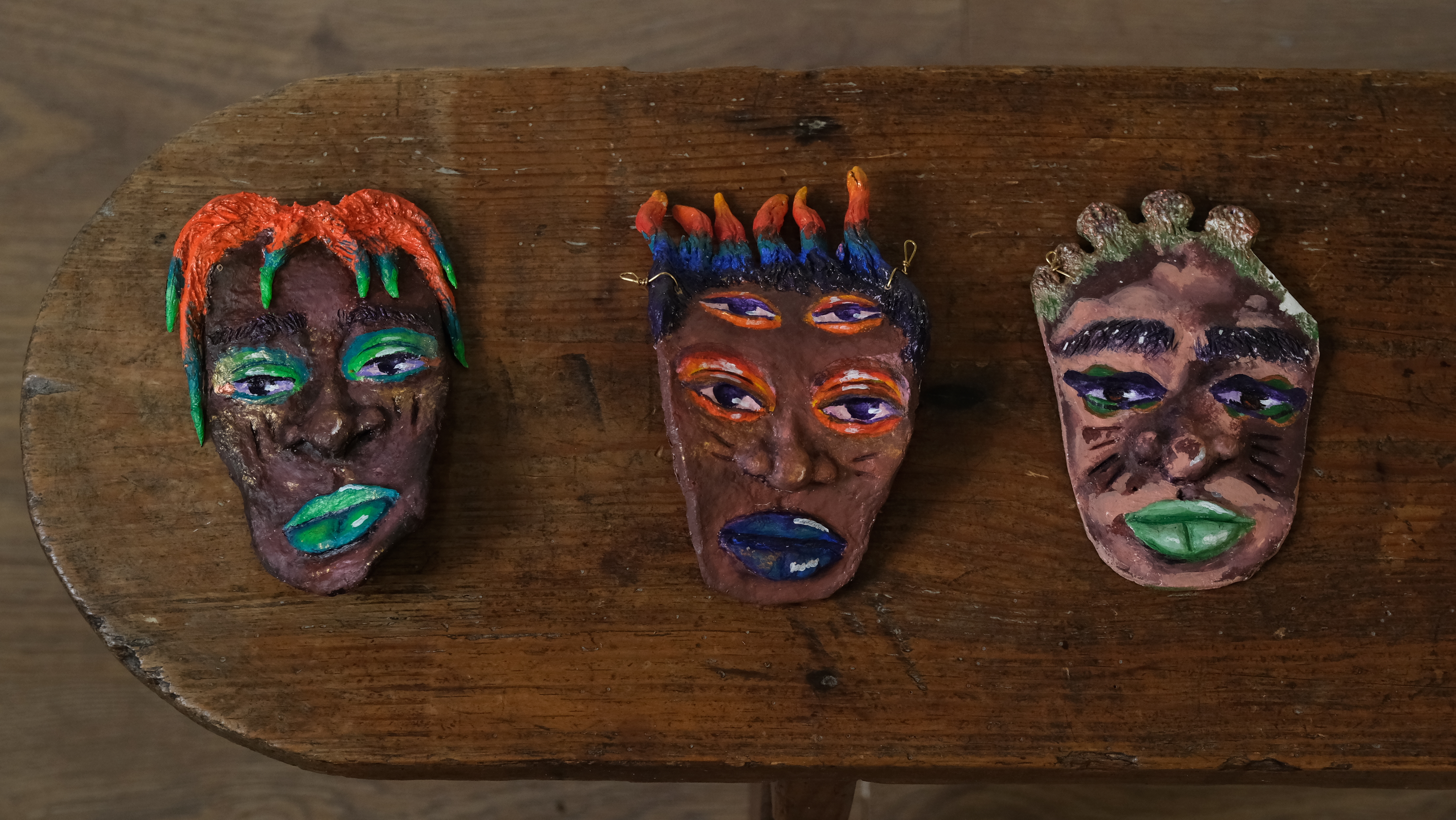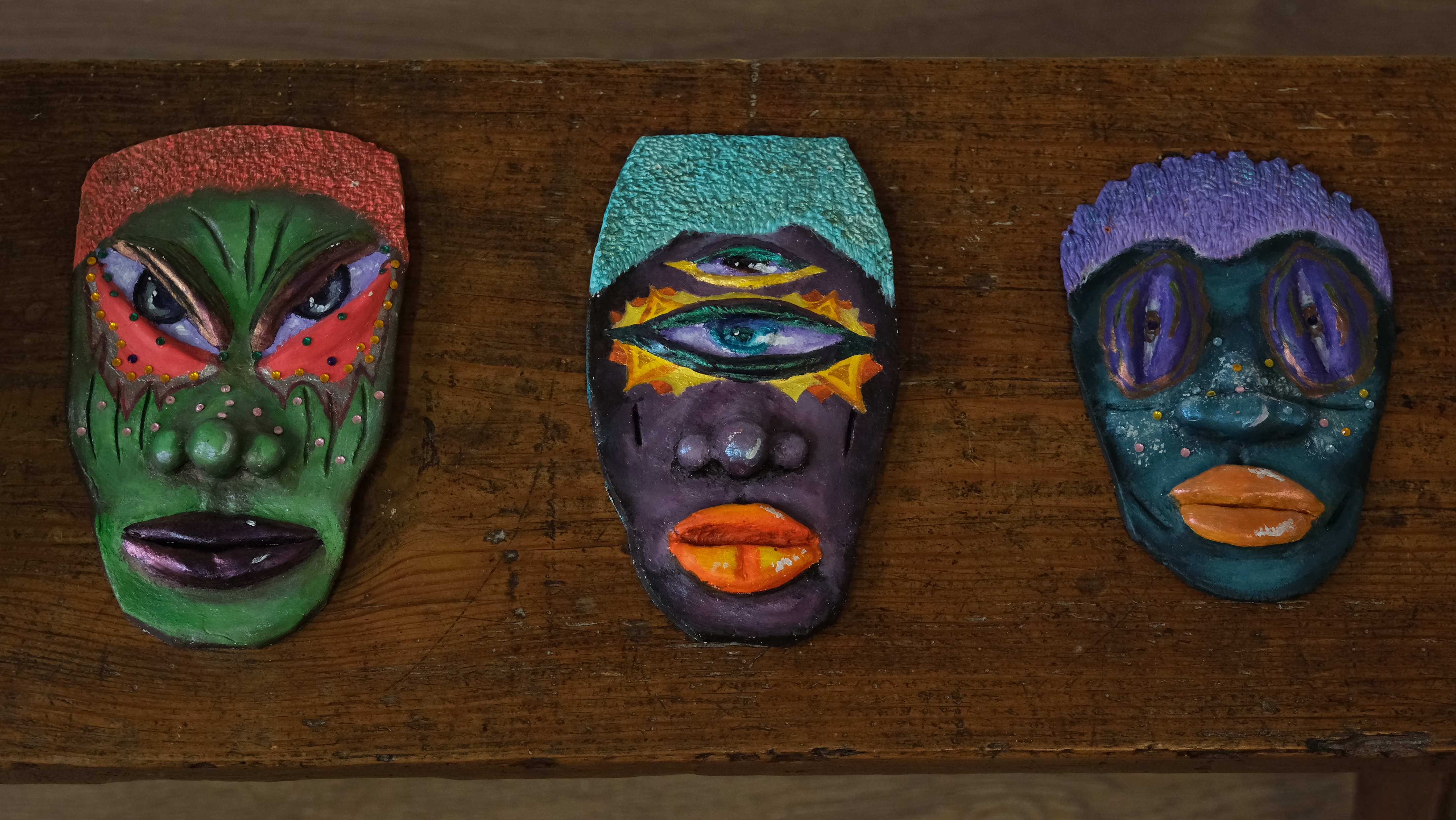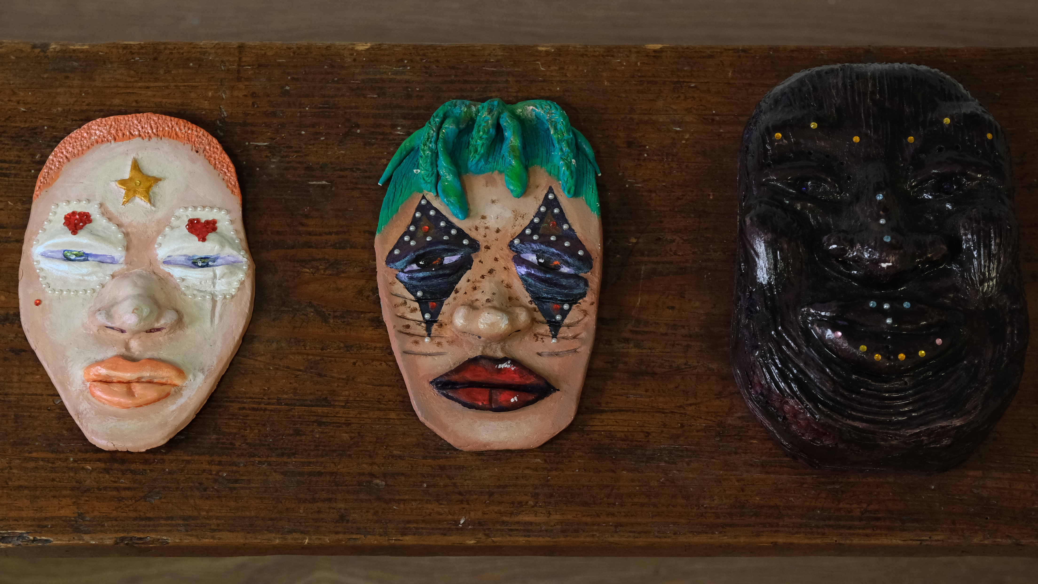 Acrylic, watercolour, and faux gemstones on clay