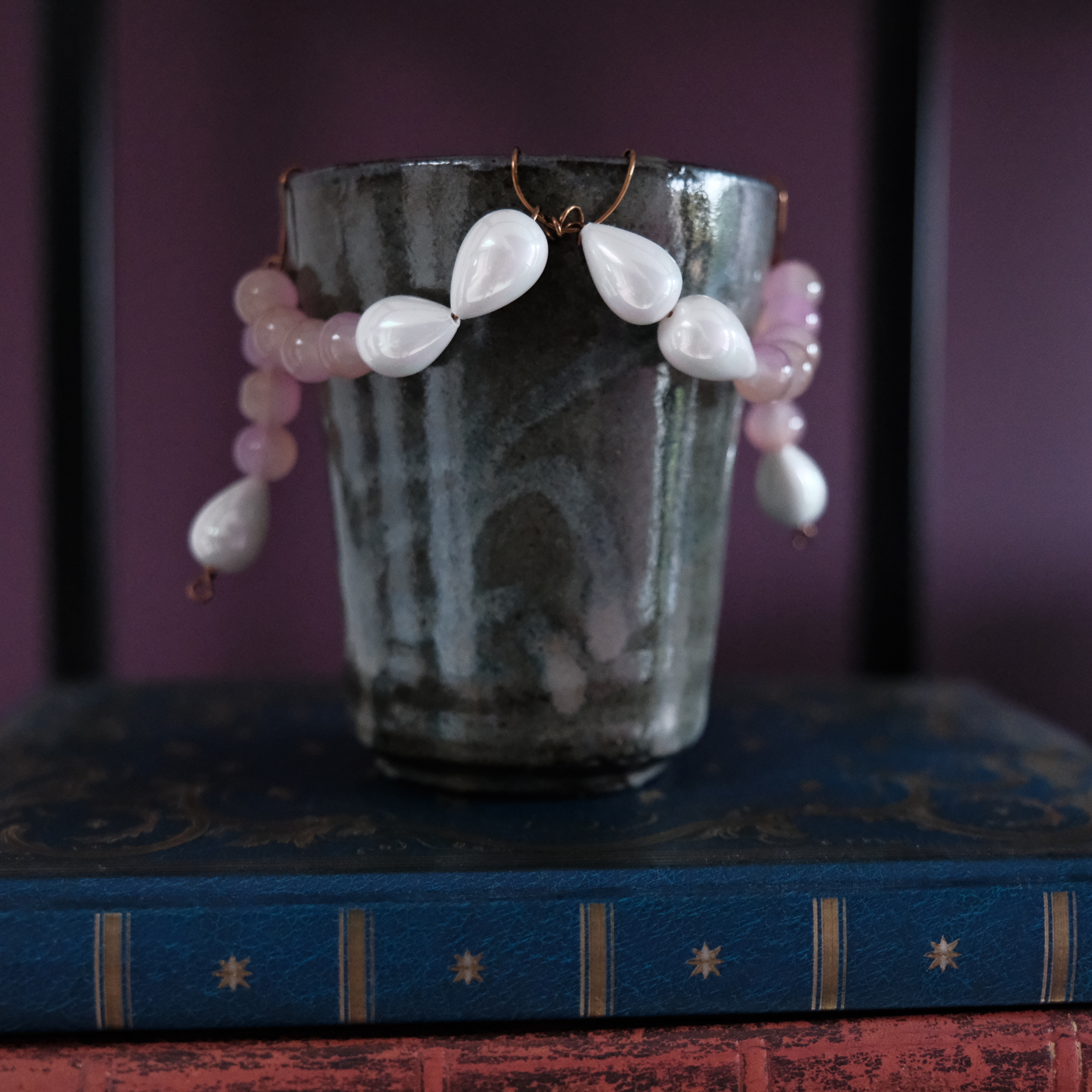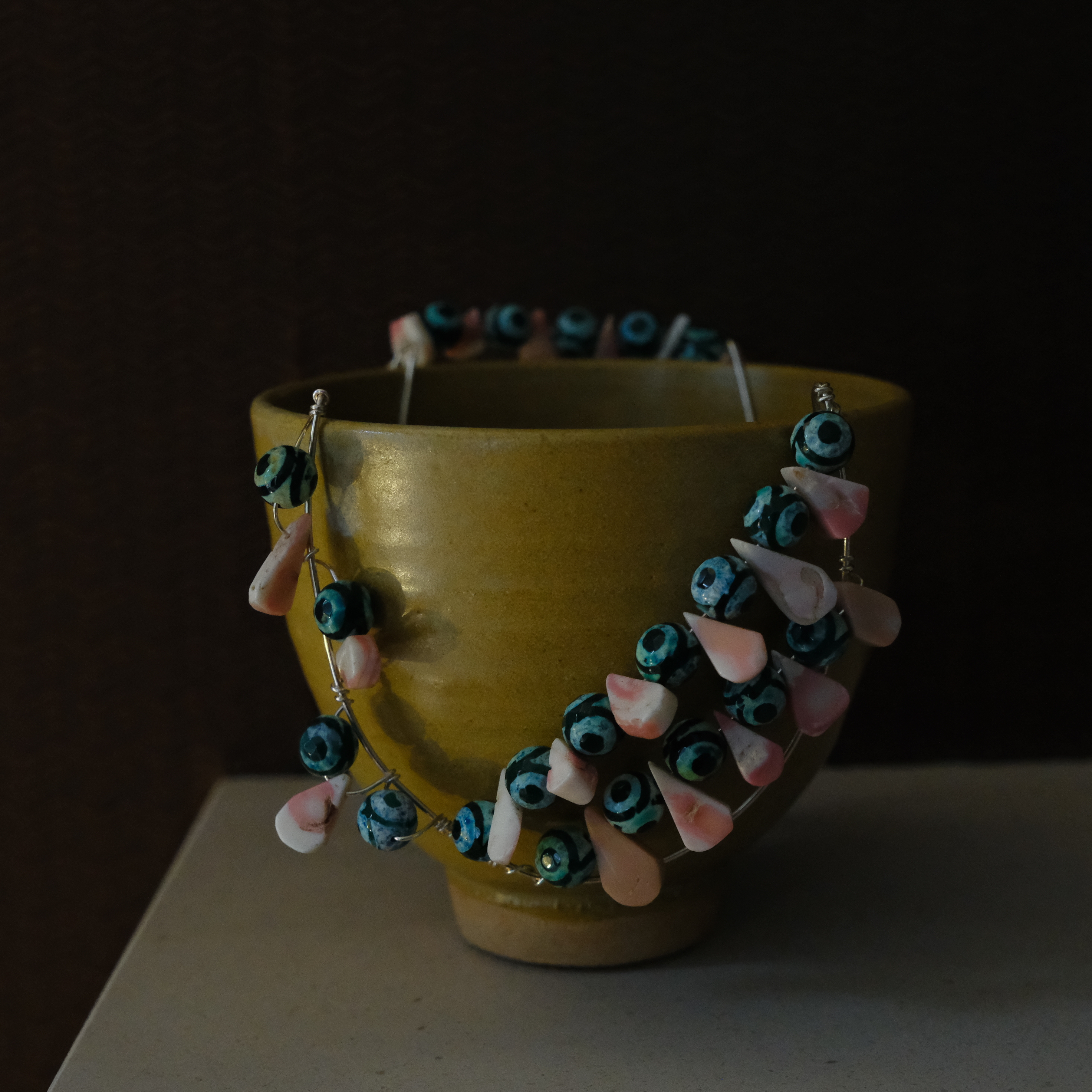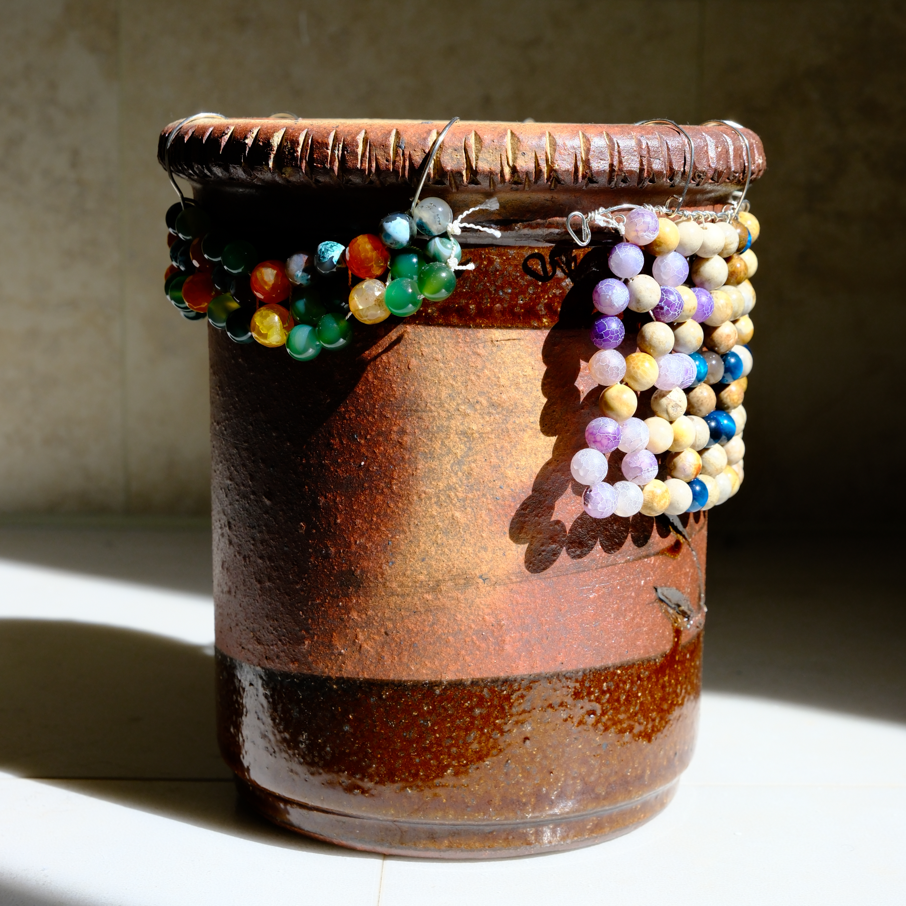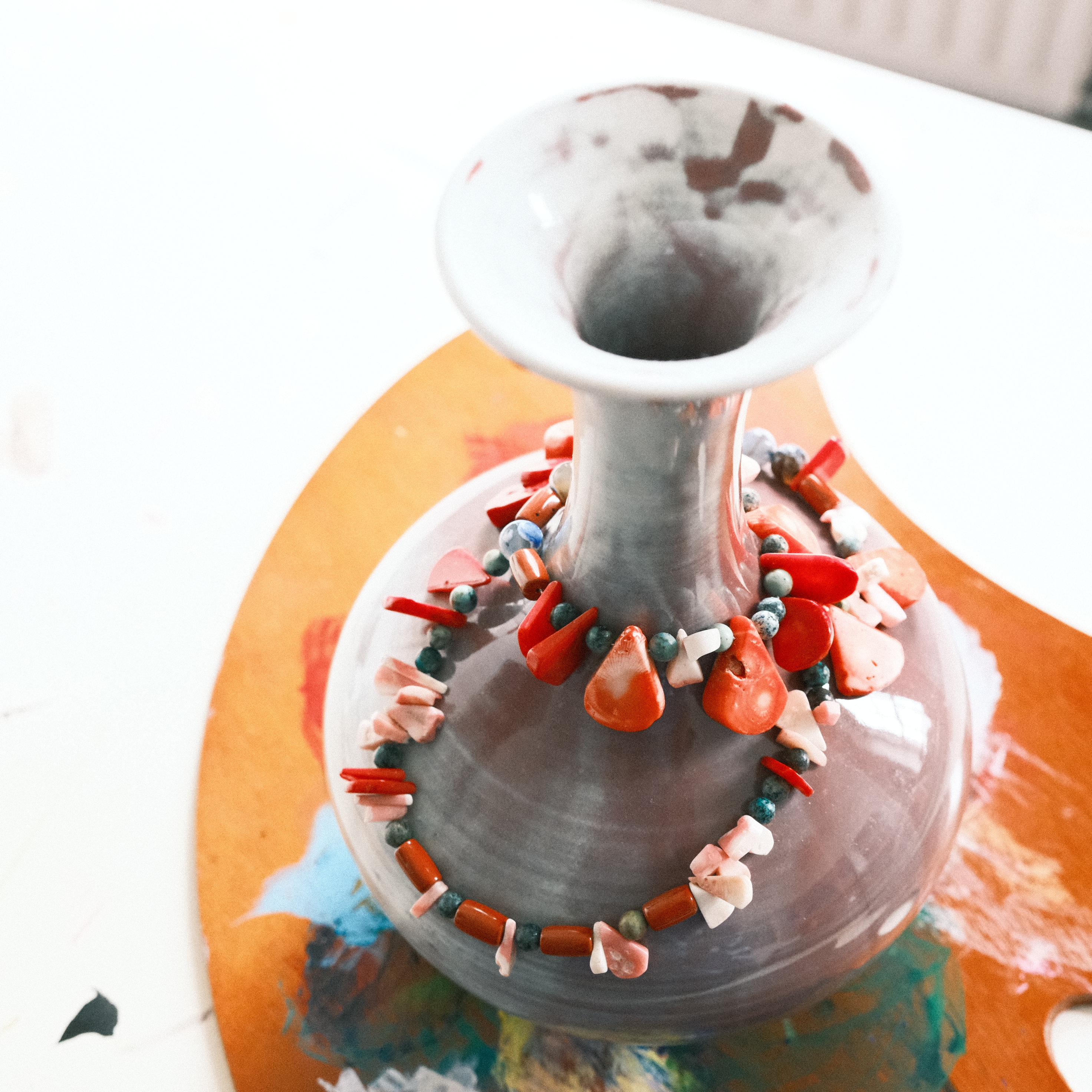 Acrylic, watercolour, and faux gemstones on clay